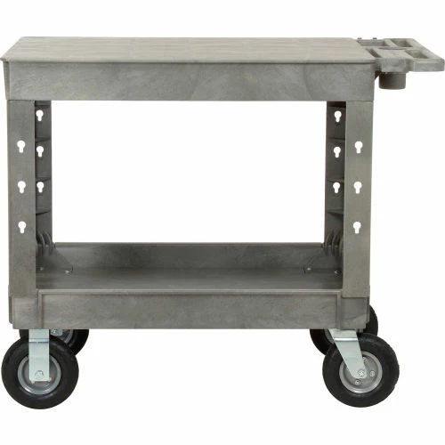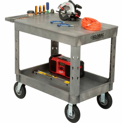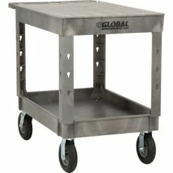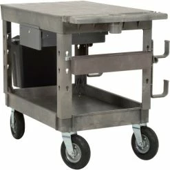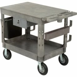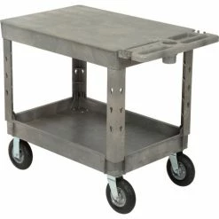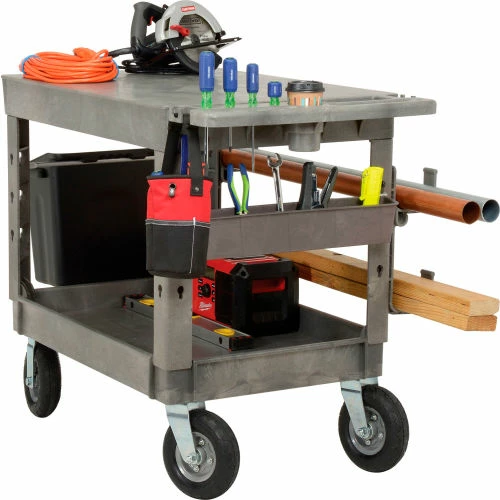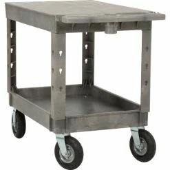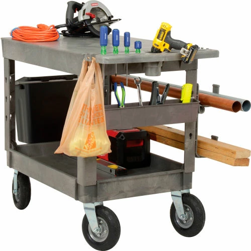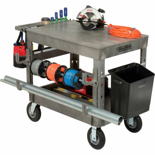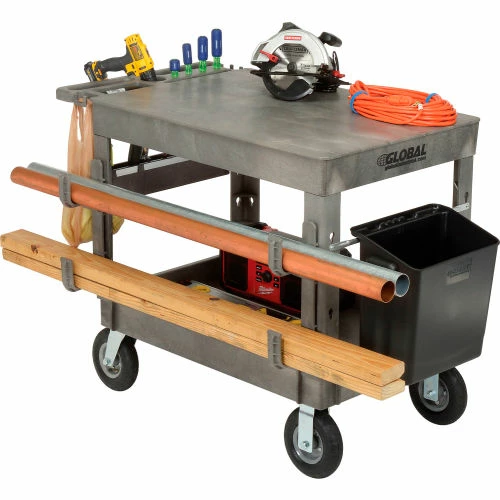 Support legs offer 4″ spaced slots on each side of the legs to hold specialized accessories to increase your productivity. Choose from hooks, spool holders or utility bins, ladder holders and power strips all designed to improve the functionality of these carts, sold separately. 500 lb. capacity; 250 lb. per shelf evenly distributed. Easy assembly.
