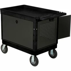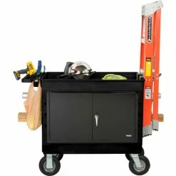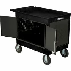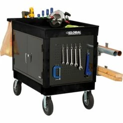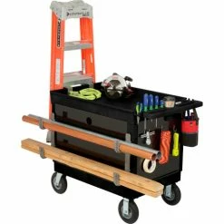Support legs offer 4″ spaced slots on each side of the legs to hold specialized accessories to increase your productivity. Choose from hooks, spool holders or utility bins, ladder holders and power strips all designed to improve the functionality of these carts, sold separately. 500lb capacity; 250lb per shelf evenly distributed. Easy assembly.