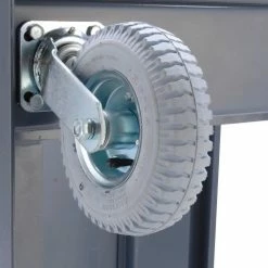 Heavy-duty 14 gauge steel frame construction with reinforced box formed table top. Four swivel casters for easy maneuverability. Pneumatic wheels absorb shock when transporting fragile items for smooth movement over uneven floors. Durable gray finish. Assembles easily.