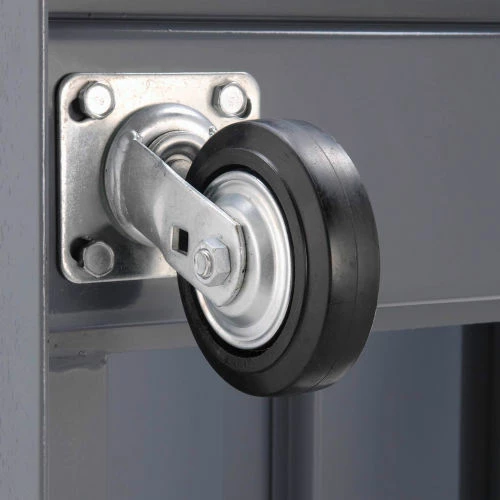 Heavy-duty 14 gauge steel frame construction with reinforced box formed table top. Four swivel casters for easy maneuverability. Durable gray finish. Assembles easily.