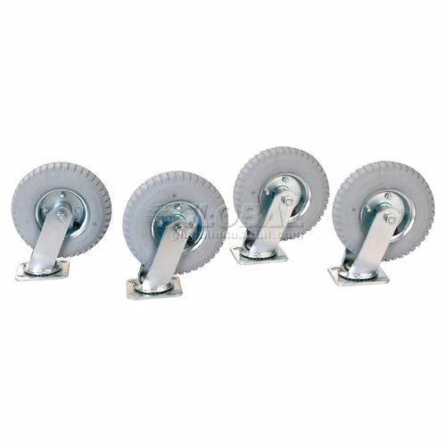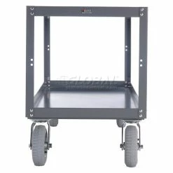 Heavy-duty 14 gauge steel frame construction with reinforced box formed table top. Four swivel casters for easy maneuverability. Pneumatic wheels absorb shock when transporting fragile items for smooth movement over uneven floors. Durable gray finish. Assembles easily.