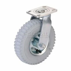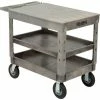 Heavy-duty 14 gauge steel frame construction with reinforced box formed table top. Four swivel casters for easy maneuverability. Pneumatic wheels absorb shock when transporting fragile items for smooth movement over uneven floors. Durable gray finish. Assembles easily.