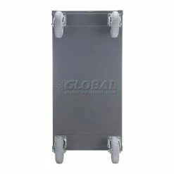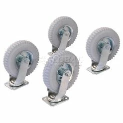 Heavy-duty 14 gauge steel frame construction with reinforced box formed table top. Four swivel casters for easy maneuverability. Pneumatic wheels absorb shock when transporting fragile items for smooth movement over uneven floors. Durable gray finish. Assembles easily.