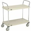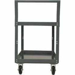 Built to handle heavy loads with ease. Sturdy 14 gauge steel shelves with rugged angle posts for maximum strength and rigidity. Retaining lip on bottom shelf prevents items from rolling off. Offset tubular push handle, two rigid and two swivel roller bearing wheels for easy maneuverability. Chip resistant gray finish.