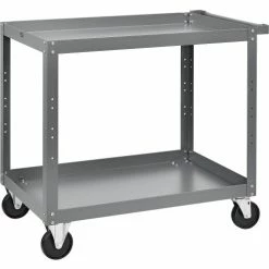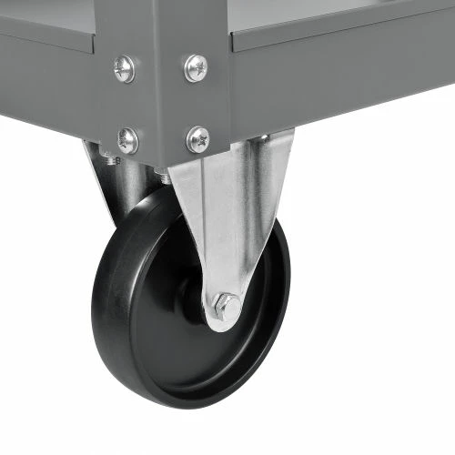 Steel Utility Cart features 16-gauge steel shelves with 2″ deep hemmed trays. The bottom shelf tray is fixed, while the other is reversible to offer a flat shelf option. Steel push handle and 5″ polypropylene wheels (2 swivel, 2 rigid casters) offer easy maneuverability. 36″H. Durable powder coat finish. Assembles easily.