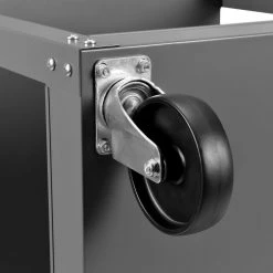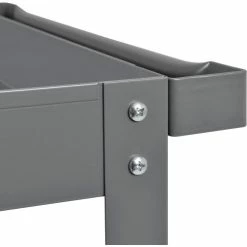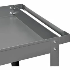 Heavy duty steel angle uprights and machine-rolled tray edges offer superior strength and rigidity. 800lb capacity cart has 12 gauge steel legs with 3″ deep 18-gauge trays. Reversible top tray offers a flat shelf alternative to ease load or unload of bulky items. Steers easily with a formed steel tubular handle and 5″ polypropylene casters (2 swivel, 2 rigid). Durable powder coat finish. Easy assembly.