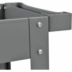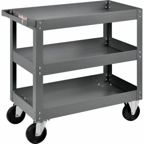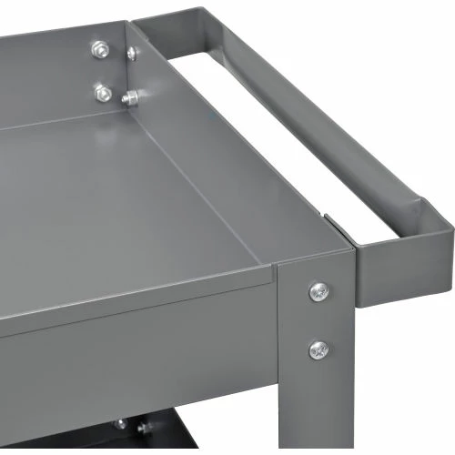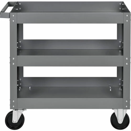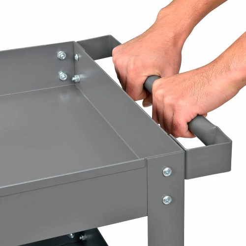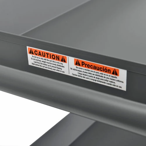 Heavy duty steel angle uprights and machine-rolled tray edges offer superior strength and rigidity. 800lb capacity cart has 12 gauge steel legs with 3″ deep 18-gauge trays. Reversible top tray offers a flat shelf alternative to ease load or unload of bulky items. Steers easily with a formed steel tubular handle and 5″ polypropylene casters (2 swivel, 2 rigid). Durable powder coat finish. Easy assembly.