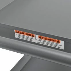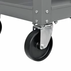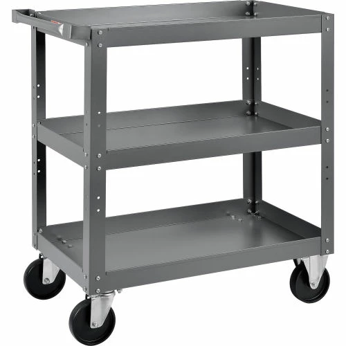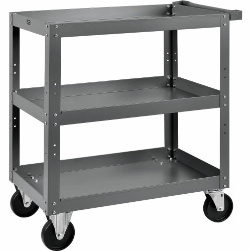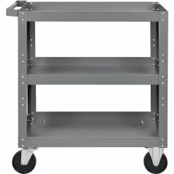 Steel Utility Cart features 16-gauge steel shelves with 2″ deep hemmed trays. The bottom shelf tray is fixed, while the others are reversible to offer a flat shelf option. Steel push handle and 5″ polypropylene wheels (2 swivel, 2 rigid casters) offer easy maneuverability. 36″H. Durable powder coat finish. Assembles easily.