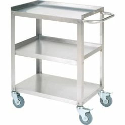 Ideal for use in clean rooms, restaurants and other corrosive environments. Premium 304 polished stainless steel throughout, with 20 gauge shelves and strong 16 gauge shelf uprights for years of service. 24″L x 16-1/4″W x 33″H with 12″ clearance between shelves. Top and middle shelves have 1-1/4″ lips on 3 sides to help retain cargo during transit, while flush lower shelf is ideal for oversized items. Comfortable tubular push handle. Rolls smoothly on four 4″ swivel non-marring rubber casters, 2 with brakes. Caster Stem Dimensions: Stem Length = 1.125″; Thread = M12 X 1.75″. Assembles easily.