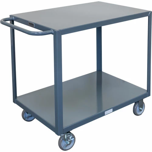 Get inventory rolling faster with better steering and support. This Global Industrialβ’ All Welded Service Cart simplifies transportation of heavy equipment and materials throughout your facility. Heavy-duty 12 gauge shelves and 10 gauge corner posts each have a durable gray powder coated finish. The smooth and flat flush shelf design provides a convenient work surface and allows for easy loading/unloading of heavy objects. The push/pull steel handle provides an additional 5″ to the overall length of cart allowing the user to easily grip and steer with comfort.