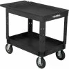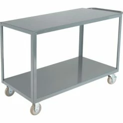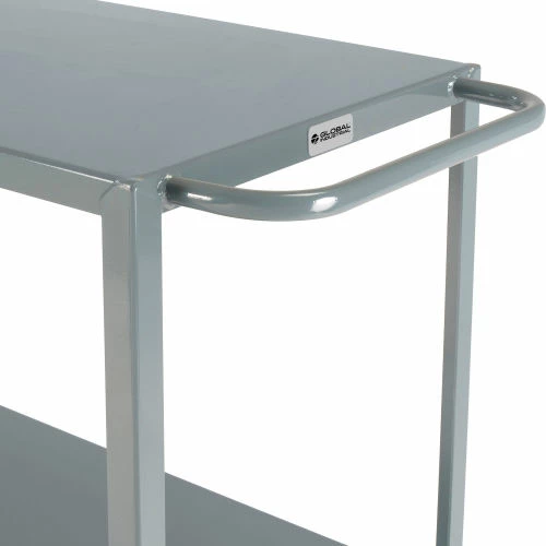 Get inventory rolling faster with better steering and support. This Global Industrialβ’ All Welded Service Cart simplifies transportation of heavy equipment and materials throughout your facility. Heavy-duty 12 gauge shelves and 10 gauge corner posts each have a durable gray powder coated finish. The smooth and flat flush shelf design provides a convenient work surface and allows for easy loading/unloading of heavy objects. The push/pull steel handle provides an additional 5″ to the overall length of cart allowing the user to easily grip and steer with comfort.