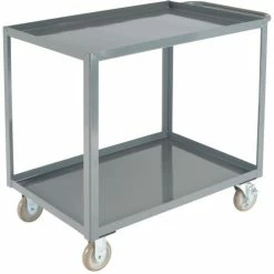 Get inventory rolling faster with better steering and support. This Global Industrialβ’ All Welded Service Cart simplifies transportation of heavy equipment and materials throughout your facility. Heavy-duty 12 gauge shelves and 10 gauge corner posts each have a durable gray powder coated finish. Tray shelves have a 1-1/2″ retaining lip that prevents items from sliding out and allows loading/unloading of heavy objects with ease. The push/pull steel handle provides an additional 5″ to the overall length of cart allowing the user to easily grip and steer with comfort.