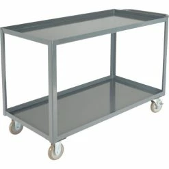 Get inventory rolling faster with better steering and support. This Global Industrialβ’ All Welded Service Cart simplifies transportation of heavy equipment and materials throughout your facility. Heavy-duty 12 gauge shelves and 10 gauge corner posts each have a durable gray powder coated finish. Tray shelves have a 1-1/2″ retaining lip that prevents items from sliding out and allows loading/unloading of heavy objects with ease. The push/pull steel handle provides an additional 5″ to the overall length of cart allowing the user to easily grip and steer with comfort.