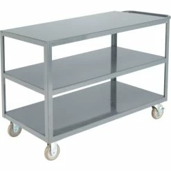 Get inventory rolling faster with better steering and support. This Global Industrialβ’ All Welded Service Cart simplifies transportation of heavy equipment and materials throughout your facility. Heavy-duty 12 gauge shelves and 10 gauge corner posts each have a durable gray powder coated finish. The smooth and flat flush shelf design provides a convenient work surface and allows for easy loading/unloading of heavy objects. The push/pull steel handle provides an additional 5″ to the overall length of cart allowing the user to easily grip and steer with comfort.