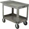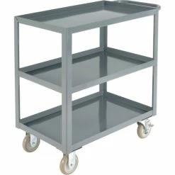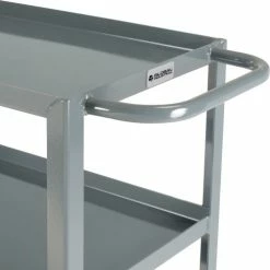 Get inventory rolling faster with better steering and support. This Global Industrialβ’ All Welded Service Cart simplifies transportation of heavy equipment and materials throughout your facility. Heavy-duty 12 gauge shelves and 10 gauge corner posts each have a durable gray powder coated finish. Tray shelves have a 1-1/2″ retaining lip that prevents items from sliding out and allows loading/unloading of heavy objects with ease. The push/pull steel handle provides an additional 5″ to the overall length of cart allowing the user to easily grip and steer with comfort.