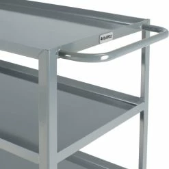 Get inventory rolling faster with better steering and support. This Global Industrialβ’ All Welded Service Cart simplifies transportation of heavy equipment and materials throughout your facility. Heavy-duty 12 gauge shelves and 10 gauge corner posts each have a durable gray powder coated finish. Tray shelves have a 1-1/2″ retaining lip that prevents items from sliding out and allows loading/unloading of heavy objects with ease. The push/pull steel handle provides an additional 5″ to the overall length of cart allowing the user to easily grip and steer with comfort.