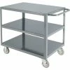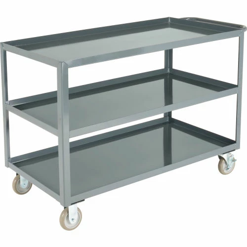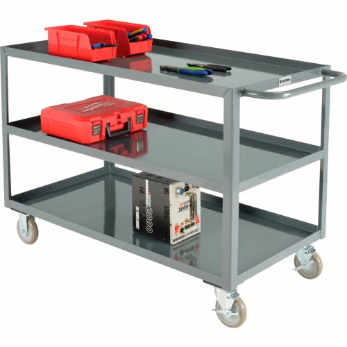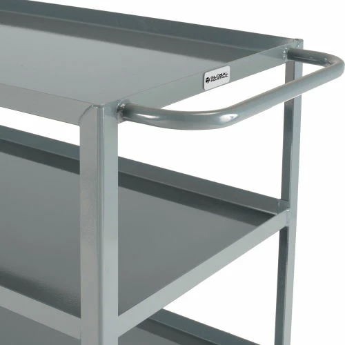 Get inventory rolling faster with better steering and support. This Global Industrialβ’ All Welded Service Cart simplifies transportation of heavy equipment and materials throughout your facility. Heavy-duty 12 gauge shelves and 10 gauge corner posts each have a durable gray powder coated finish. Tray shelves have a 1-1/2″ retaining lip that prevents items from sliding out and allows loading/unloading of heavy objects with ease. The push/pull steel handle provides an additional 5″ to the overall length of cart allowing the user to easily grip and steer with comfort.