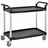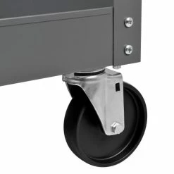 Heavy duty steel angle uprights and machine-rolled tray edges offer superior strength and rigidity. 800lb capacity cart has 12 gauge steel legs with 3″ deep 18-gauge trays. Reversible top tray offers a flat shelf alternative to ease load or unload of bulky items. Steers easily with a formed steel tubular handle and 5″ polypropylene casters (2 swivel, 2 rigid). Durable powder coat finish. Easy assembly.