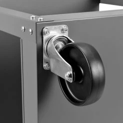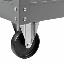 Heavy duty steel angle uprights and machine-rolled tray edges offer superior strength and rigidity. 800lb capacity cart has 12 gauge steel legs with 3″ deep 18-gauge trays. Reversible top tray offers a flat shelf alternative to ease load or unload of bulky items. Steers easily with a formed steel tubular handle and 5″ polypropylene casters (2 swivel, 2 rigid). Durable powder coat finish. Easy assembly.