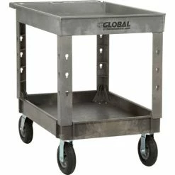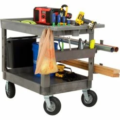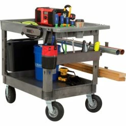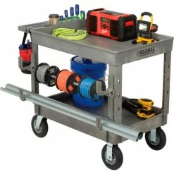 Support legs offer 4″ spaced slots on each side of the legs to hold specialized accessories to increase your productivity. Choose from hooks, spool holders or utility bins, ladder holders and power strips all designed to improve the functionality of these carts, sold separately. 500 lb. capacity; 250 lb. per shelf evenly distributed. Easy assembly.