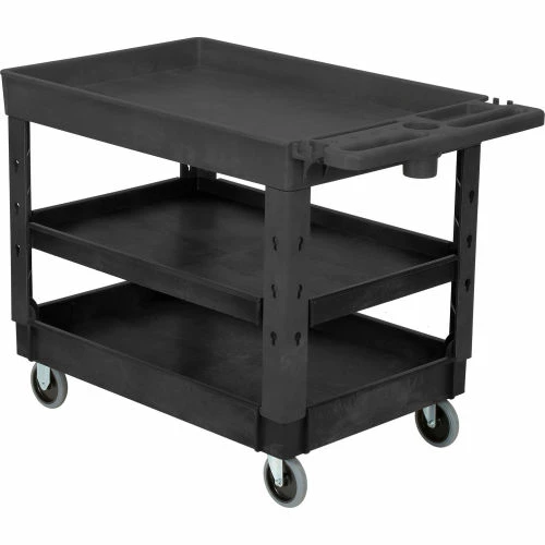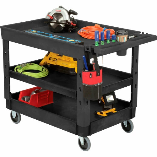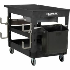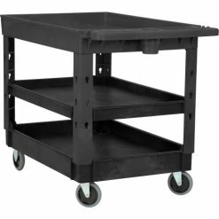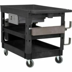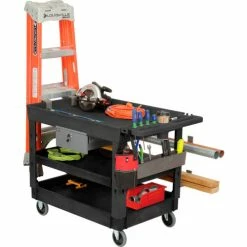 Support legs offer 4″ spaced slots on each side of the legs to hold specialized accessories to increase your productivity. Choose from hooks, spool holders or utility/trash bins, ladder holders and power strips all designed to improve the functionality of these carts, sold separately. 500 lb. capacity; 250 lb. per shelf evenly distributed not to exceed overall capacity. Easy assembly.