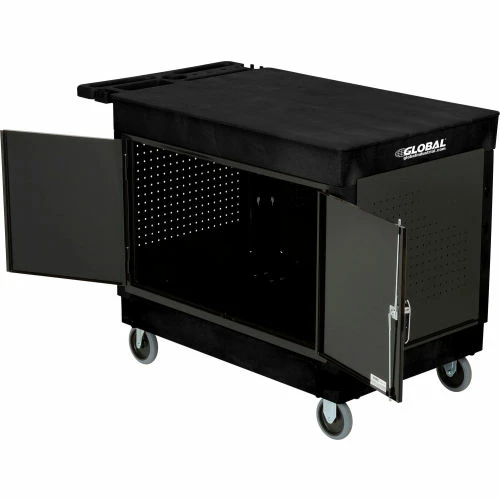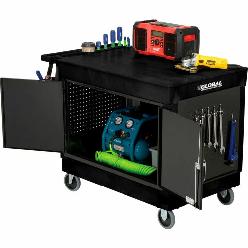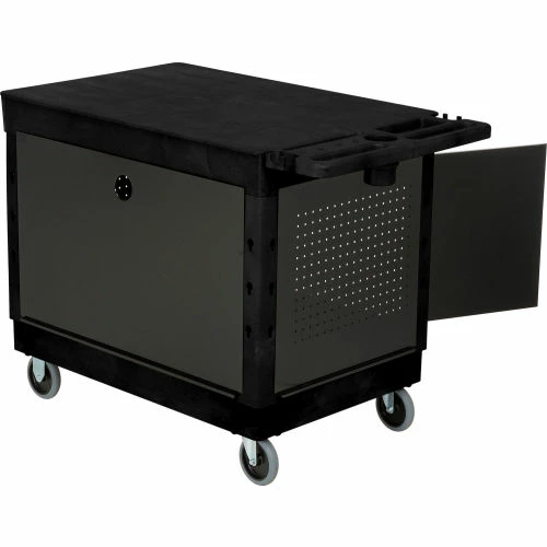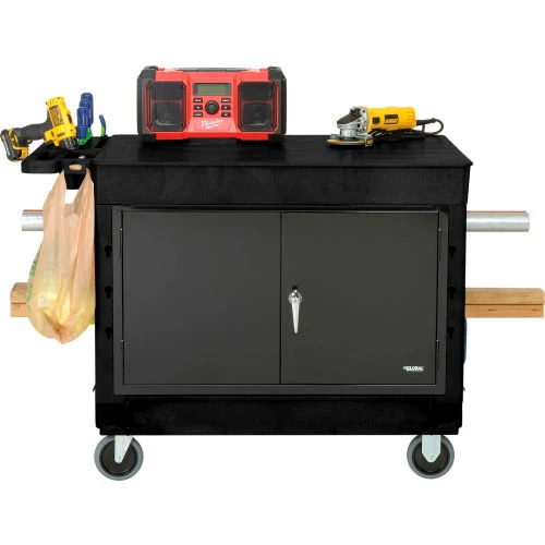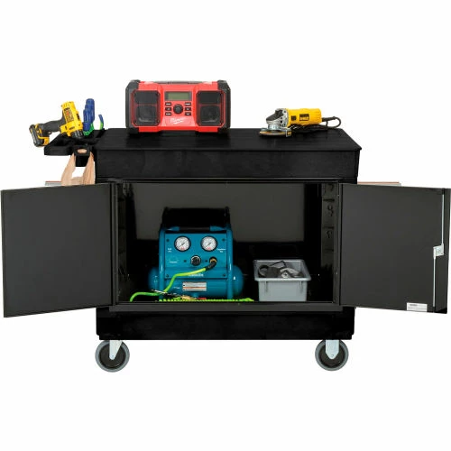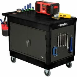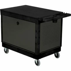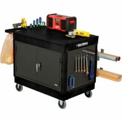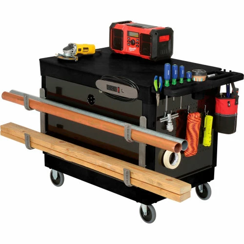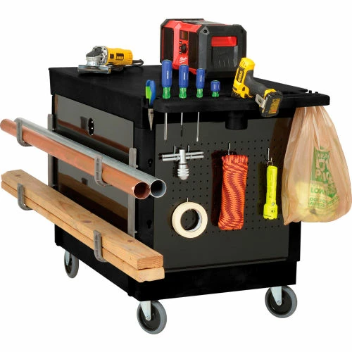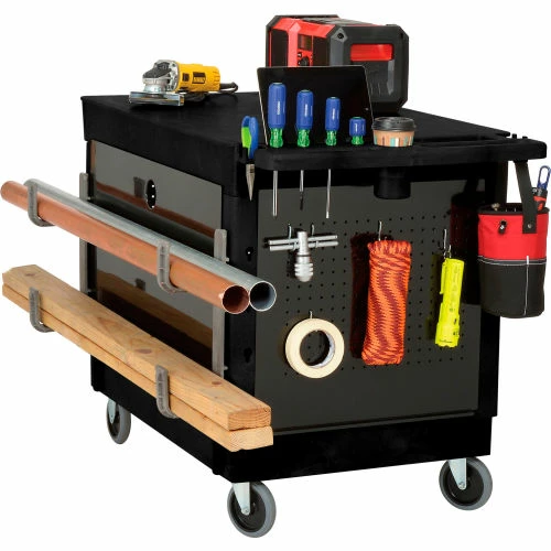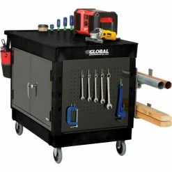 Support legs offer 4″ spaced slots on each side of the legs to hold specialized accessories to increase your productivity. Choose from hooks, spool holders or utility bins, ladder holders and power strips all designed to improve the functionality of these carts, sold separately. 500lb capacity; 250lb per shelf evenly distributed. Easy assembly.