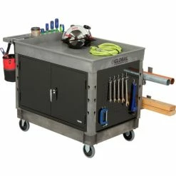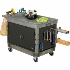 Support legs offer 4″ spaced slots on each side of the legs to hold specialized accessories to increase your productivity. Choose from hooks, spool holders or utility bins, ladder holders and power strips all designed to improve the functionality of these carts, sold separately. 500lb capacity; 250lb per shelf evenly distributed. Easy assembly.