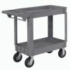 Heavy duty, tough structural foam plastic construction resists scratches, dents and cleans easily. 3″ deep trays help to retain cargo during transit. Lightweight cart maneuvers easily on 2 swivel, 2 rigid 6″ full pneumatic casters for a soft ride and easy rolling over rough surfaces. Storage trays has a inside dimension of 36″L x 24-1/2″W x 2-3/4″H. Assembles easily. Personalize your plastic utility service cart with our great accessories. 1 Year Limited Warranty.