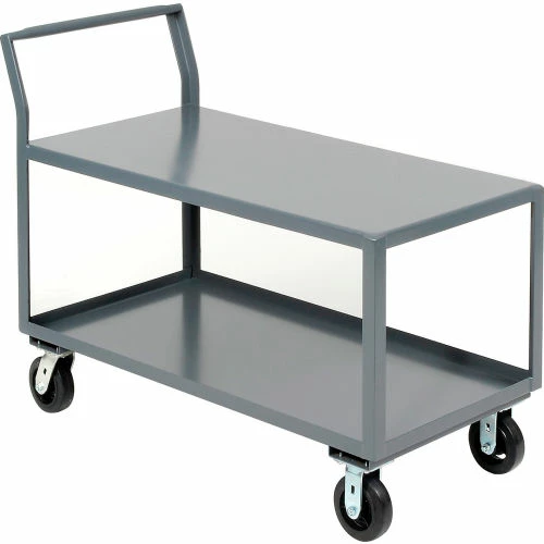 Built to handle heavy loads with ease. Sturdy 12 gauge steel shelves with rugged angle posts for maximum strength and rigidity. Retaining lip on bottom shelf prevents items from rolling off. Offset tubular push handle, two rigid and two swivel roller bearing wheels for easy maneuverability. Chip resistant gray finish.