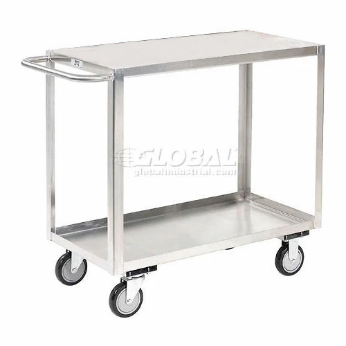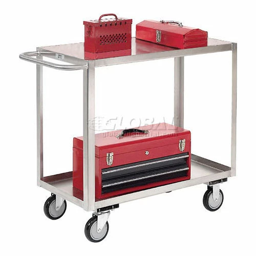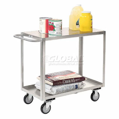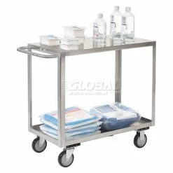 All welded stainless steel cart is perfect for use in corrosive applications at labs, restaurants and hospitals. Premium 16 gauge #4 polished shelves and 17 gauge uprights ensure years of service. Flush Top Shelf is ideal for carrying oversized loads. 1-1/2″ perimeter lip on lower shelves help retain cargo during transit. Comfortable tubular push handle and rolls smoothly on 2 swivel, 2 rigid 5″ polyurethane casters. Shipped assembled.