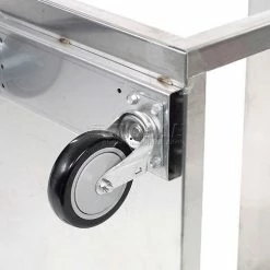 All welded stainless steel cart is perfect for use in corrosive applications at labs, restaurants and hospitals. Premium 16 gauge #4 polished shelves and 17 gauge uprights ensure years of service. 1-1/2″ perimeter lip on shelves help retain cargo during transit. Comfortable tubular push handle and rolls smoothly on 2 swivel, 2 rigid 5″ polyurethane casters. Shipped assembled.
