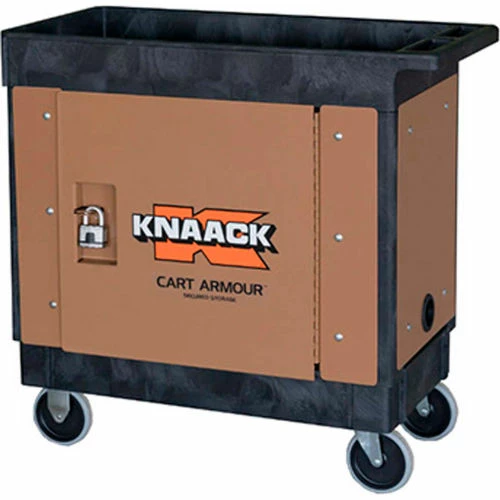 Cart Armour CA-02 is an interlocking steel paneling system that encapsulates mobile work carts to secure them and their contents from theft. The patent pending design incorporates all 16g steel panels that can be installed in 15 minutes or less. The design also allows for installation on new carts or retro-fitting on existing cart models already in service, without having to modify the cart in any way. The recessed padlock design allows usage of a variety of padlocks, while keeping the lock free from snagging on doorways, materials, or clothing. Electrical pass-through with grommet allows power to be run to the interior of the cart while keeping the cord free from damage. The CA-02 fits Rubbermaid* cart model 9T66-00. Rubbermaidยฎ is a trademark of its respective owner. There is no affiliation, sponsorship or association between Knaack LLC and said owner. This product has 5 Years Limited Warranty.