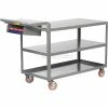 This Lakesideยฎ Handlerโข Stainless Steel Utility Cart makes maneuvering in confined spaces easy. Unique one-piece vertical handle offers more control when pushing heavy loads. Rust and stain resistant stainless steel carts feature a durable, unitized electronically welded angle leg design for added strength. Shelves are reinforced with a hemmed front. Sound deadening panels under shelves restrict vibration and noise. Bumpers on legs protect walls and furniture. Top and middle shelf feature raised retaining lips on 3 sides. Easy-to-clean. Moves easily on swivel casters. 3 shelf quantity. 300 lb. capacity. 28-1/2″L x 16-1/4″W x 34-1/8″H overall.