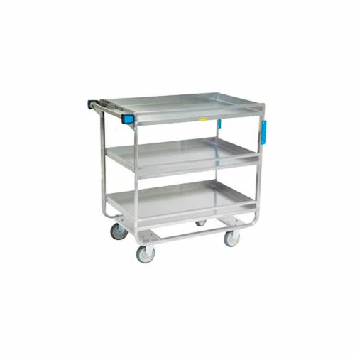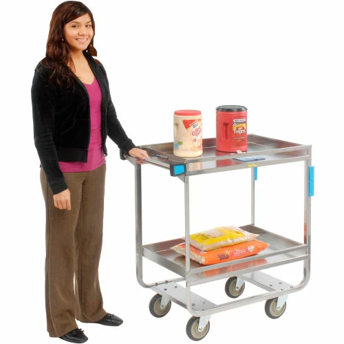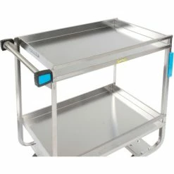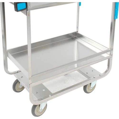 This Lakeside® Guard Rail Stainless Steel Utility Cart helps retain items during transport. Stainless steel carts feature a durable, unitized electronically welded angle leg design for added strength. Shelves are reinforced with a hemmed front. Sound deadening panels under shelves restrict vibration and noise. Bumpers on legs and handles protect walls and furniture. Shelves feature raised retaining lips on 3 sides and a guard rail on front. Easy-to-clean. Moves easily on swivel casters. 2 shelf quantity. 700 lb. capacity. 38-5/8″L x 22-3/8″W x 37-1/4″H overall.