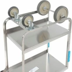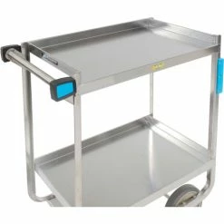 This Lakeside® Heavy Duty Stainless Steel Utility Cart is ideal for receiving goods, moving loads for ware-washing and transporting loads up to 700 lbs. This stainless steel cart features unitized electronic welding and an angle U-frame design for extra strength. Made using 1/8″ thick stainless steel legs and 18 gauge shelves. Stain and rust resistant shelves are reinforced with a hemmed front. Shelves feature raised retaining edges on 3 sides. Bumpers on legs and handle protect walls and furniture. Easy-to-clean. Moves easily on non-marring 2 rigid, 2 swivel casters. 2 shelf quantity. 700 lb. capacity. 32-5/8″L x 19-3/8″W x 34-1/2″H overall.