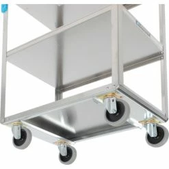 This Lakeside® Stainless Steel Utility Cart is ideal for dining area bussing, set-up tray stations, soiled dish stations and transporting light loads. This stainless steel cart features a durable, unitized electronically welded angle leg design for added strength. Shelves are reinforced with a hemmed front. Sound deadening panels under shelves restrict vibration and noise. Bumpers on legs and handles protect walls and furniture. Top and middle shelf feature raised retaining lips on 3 sides. Easy-to-clean. Moves easily on swivel casters. 3 shelf quantity. 500 lb. capacity. 31″L x 19″W x 32″H overall.