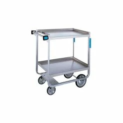 This Lakeside® Heavy Duty Stainless Steel Utility Cart is ideal for receiving goods, moving loads for ware-washing and transporting loads up to 700 lbs. This stainless steel cart features unitized electronic welding and an angle U-frame design for extra strength. Made using 1/8″ thick stainless steel legs and 18 gauge shelves. Stain and rust resistant shelves are reinforced with a hemmed front. Shelves feature raised retaining edges on 3 sides. Bumpers on legs and handle protect walls and furniture. Easy-to-clean. Moves easily on non-marring 2 rigid, 2 swivel casters. 2 shelf quantity. 700 lb. capacity. 34-1/4″L x 16-1/4″W x 34-1/4″H overall. NSF Listed.