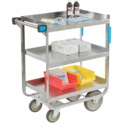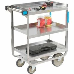 This Lakeside® Heavy Duty Stainless Steel Utility Cart is ideal for receiving goods, moving loads for ware-washing and transporting loads up to 700 lbs. This stainless steel cart features unitized electronic welding and an angle U-frame design for extra strength. Made using 1/8″ thick stainless steel legs and 18 gauge shelves. Stain and rust resistant shelves are reinforced with a hemmed front. Shelves feature raised retaining edges on 3 sides. Bumpers on legs and handle protect walls and furniture. Easy-to-clean. Moves easily on non-marring 2 rigid, 2 swivel casters. 3 shelf quantity. 700 lb. capacity. 37-1/8″L x 22-3/8″W x 37-1/8″H overall. NSF Listed.