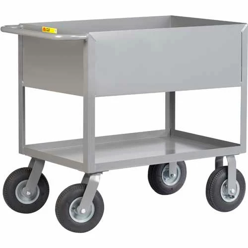 Cushion Load Deep Shelf Trucks, 1200 lbs. Capacity – Large, cushion-load wheels roll over rough and uneven surfaces, and deep top trays help to retain the load. All-welded construction with 12 gauge shelves ships fully assembled and ready for immediate use. Durable powder coated finish. 10″ Puncture-proof solid rubber casters, 36-1/2″ overall height. 12-Inch Deep Top Shelf Bottom shelf 1-1/2″ deep, 11″ shelf clearance.