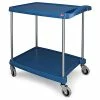Flush handle allows transporting of oversized items. Provides a cushioned ride with 9″ pneumatic casters, 2 swivel and 2 rigid. Top shelf 33-1/2″ high, and is available with a 1-1/2″ retaining lip or with flush edges. Bottom shelf has 1-1/2″ lip. Available with non-slip vinyl laminated to shelf surfaces, or smooth steel surfaces. 18″ shelf clearance, 14 gauge shelves. Gray enamel finish.