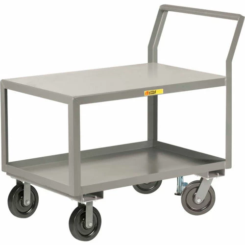 This ergonomically designed utility cart features a kick back style sloped handle to ensure a safe and comfortable grip while reducing operator fatigue. The heavy-duty construction features fully-welded 12 gauge shelves. Rolls easily on 2 rigid, and 2 swivel 8″ phenolic casters. Top shelf features flush edges, while bottom shelf has 1-1/2″ retaining lips. 28″ top shelf height. This unit features a floor lock to stop unwanted movement while loading and unloading. This product has Limited Warranty of 1 Year.