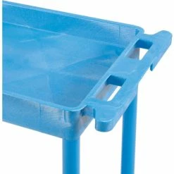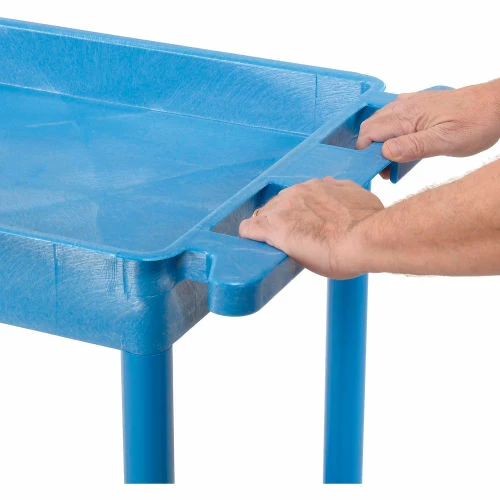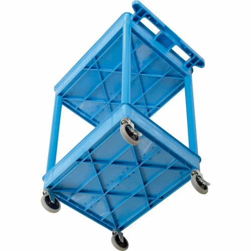 Durable polyethylene carts are available in colors to suit dΓ©cor or track use; ideal for food service applications. Tray shelves are 2-3/4″ deep to help retain cargo and are reinforced with aluminum bars for additional strength. Comfortable push handle is molded into the top shelf. Rolls easily on durable 4″ non-marring rubber swivel casters (2 with brakes). Easy assembly.