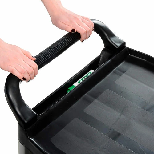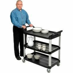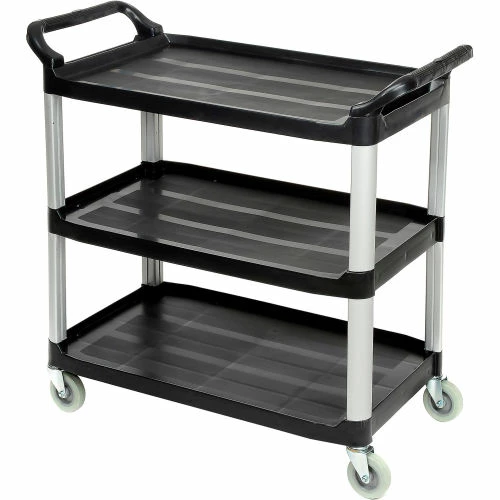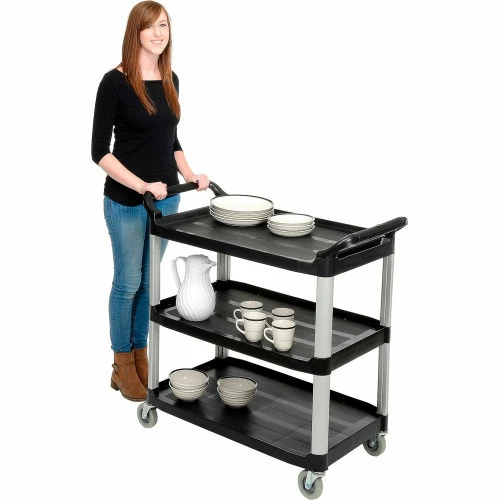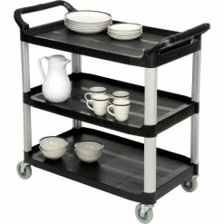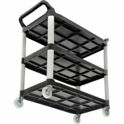 This serving cart can be used in restaurants, cafeterias, offices or any environment that requires a functional and easy to clean cart; ideal for food service applications. Durable polypropylene plastic construction resists scratches, chips and dents. Lightweight aluminum uprights provide strength and rigidity. All shelves feature a 1″ lip on three sides to help retain cargo during transport. Comfortable push handles offer easy steering. Rolls easily on non-marring PVC swivel casters. Assembles easily. Lifetime Limited Warranty!