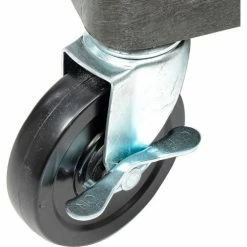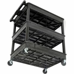 Durable polyethylene, reinforced cart is strong, yet lightweight; ideal for food service applications. Tray Top Shelves offer 2-3/4″ deep trays to contain cargo during transport. Comfortable push handle has convenient cord wrap molded into top shelf. Rolls easily on durable 4″ non-marring rubber swivel casters (2 with brakes). Easy, snap-together assembly.Lifetime Limited Warranty!