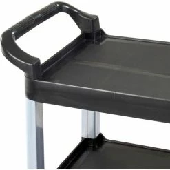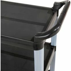 This serving cart can be used in restaurants, cafeterias, offices or any environment that requires a functional and easy to clean cart; ideal for food service applications. Durable polypropylene plastic construction resists scratches, chips and dents. Lightweight aluminum uprights provide strength and rigidity. All shelves feature a 1″ lip on three sides to help retain cargo during transport. Comfortable push handles offer easy steering. Rolls easily on non-marring PVC swivel casters. Assembles easily. Lifetime Limited Warranty!