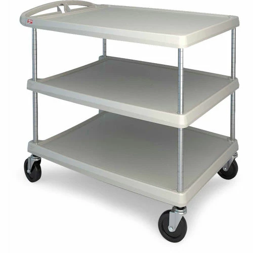 If you’re looking for a cart idea for school settings, check out the Metro myCartβ’ Three-Shelf Utility Cart with Chrome-Plated Posts and 34×27″ Shelves. This cart made of injection-molded polyethylene is lightweight and durable. Whether you need a hospital cart or something around the office, the raised lip on each shelf helps keep small items in place. The molded handle and impact-resistant surfaces wipe clean quickly and easily. On top of this, the mobile cart for hospital, restaurant, or school settings can safely carry up to 500 lb. of equipment, paperwork, and more. It is NSF Certified and comes in gray.Top shelf is 27-11/16 x 40-1/4″, Bottom and middle shelves are 27-11/16 x 37-7/16″