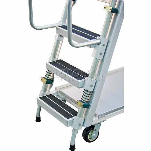 Stock picking carts minimize the risk of injuries when pulling stock orders or restocking shelves. Step ladder cart features a spring-loaded ladder that safely holds the cart in place for safe climbing and loading. Extra-wide steps are welded and bolted in place and feature non-slip tape for added safety. Continuous grip handle features an extended reach bar on the top, and the offset push handle saves your shins when climbing. All welded aluminum construction for years of service; Lifetime Warranty against rust and corrosion. Rolls smoothly with 5″ rubber casters (2 swivel, 2 rigid).