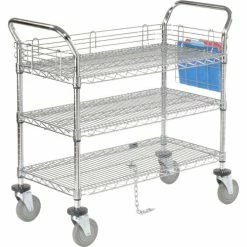 - Includes 3 shelves, 2 U handles, snap-on sleeves and polyurethane swivel casters, two with brakes