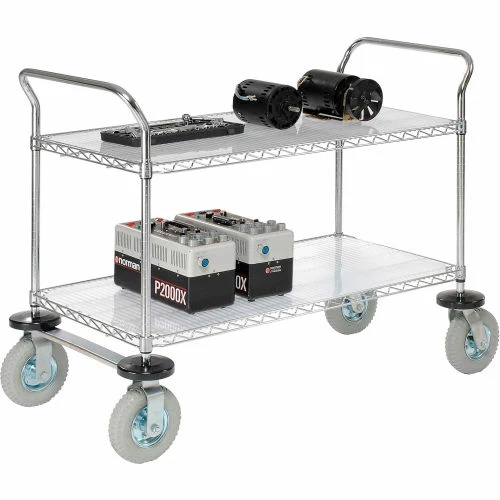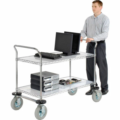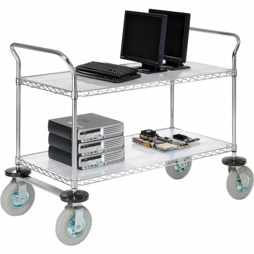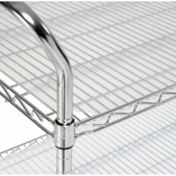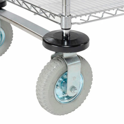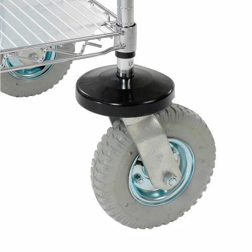 Securely transport and store valuable, sensitive equipment. Ideal for bulky items, too. Nickel chrome plated wire is attractive and rust resistant. Non-conductive 0.035″ clear polyethylene shelf liners included. Shelves are adjustable on 1″ increments. Shock absorbing 8″ pneumatic wheels (2 swivel, 2 rigid) are smooth rolling and highly maneuverable. Donut bumpers help protect the walls. 44″ overall height. Assembles easily. 1 Year Limited Warranty when used in a dry storage application.