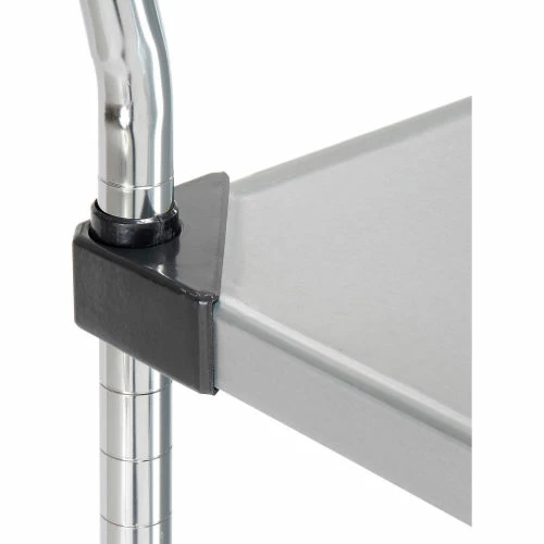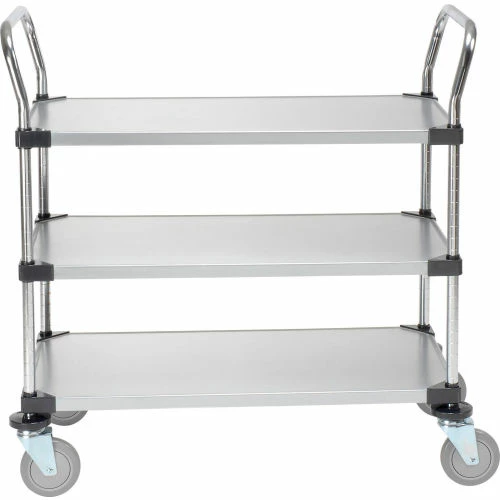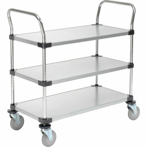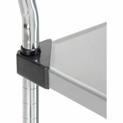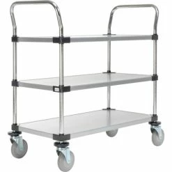 Durable, corrosion resistant carts are perfect for hospitals, clean rooms and labs. 18 gauge galvanized steel shelves have clear epoxy coating to provide years of service. Shelves adjust on 1″ increments on numbered posts to accommodate various sized loads. Handles have a bright, chrome plated finish. 5″ x 1-1/4″ polyurethane swivel casters with donut bumpers to help protect walls. 38″H. Easy assembly. This product has Limited Warranty of 1 Year.